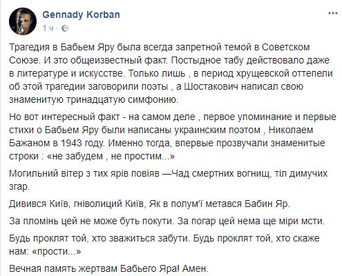 Геннадий Корбан: "Трагедия в Бабьем Яру была всегда запретной темой в Советском Союзе. И это общеизвестный факт. Постыдное табу действовало даже в литературе и искусстве. Только лишь , в период хрущевской оттепели об этой трагедии заговорили поэты , а Шостакович написал свою знаменитую тринадцатую симфонию.