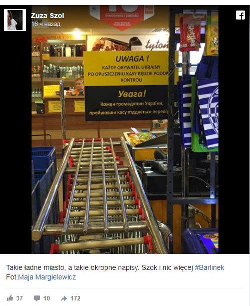 В Польше разразился очередной скандал, связанный с украинцами. Владелец магазина Ежи Битель повесил табличку, призывающую проверять каждого гражданина Украины на кассе. Это случилось после того, как украинец украл две сумки продуктов. Позже хозяин торговой точки объяснил, что повесил табличку под влиянием импульса и через сутки снял. Также он извинился перед всеми, кого это обидело.