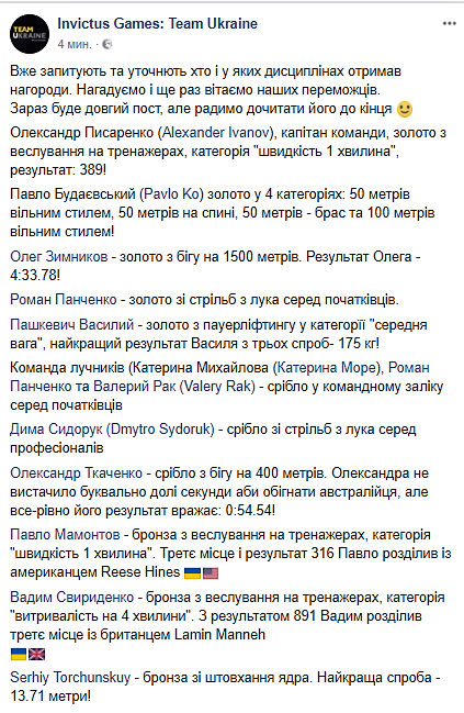 "Учитывая, что наша команда - одна из самых маленьких - всего 15 человек основного состава, то хочется верить, что команда #InvictusGamesTeamUkraine убедила весь мир, наши военные - сильные духом и телом и никогда не поддаются ни врагам, ни жизненным обстоятельствам", - говорится в сообщении.