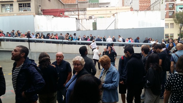 10:14 Референдум начался. На избирательный участок в самой большой школе Барселоны Escola del treball только что зашли 19 человек - они станут волонтерами и будут организовать голосование. Тысячи людей ожидают возможность проголосовать во дворе школы. Полиция обещала быть здесь в шесть утра, но никто не пришел. "Мы ждем, что в течение дня явится Гражданская гвардия", - говорит "Стране" волонтер Цави.