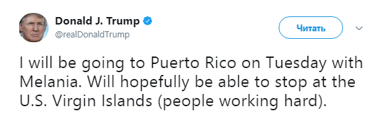 " Я собираюсь в Пуэрто-Рико во вторник с Меланией", — написал он и выразил надежду, что они смогут остановиться на Виргинских островах.