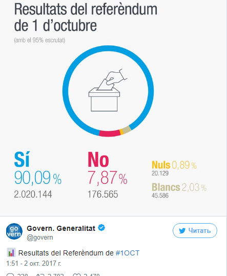 По данным Турула, 2 млн 20 тыс. 144 человека поддержали отделение Каталонии, 176 565 — высказались против, 45 586 бюллетеней оказались пустыми, а 20 129 были признаны недействительными.