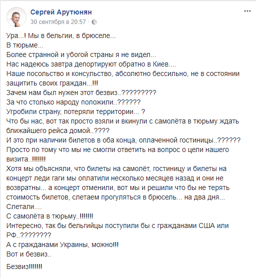 "Наше посольство и консульство, абсолютно бессильно, не в состоянии защитить своих граждан! Зачем нам был нужен этот безвиз? За что столько народу положили? Угробили страну, потеряли территории? Что бы нас, вот так просто взяли и выкинули с самолёта в тюрьму ждать ближайшего рейса домой? И это при наличии билетов в оба конца, оплаченной гостиницы?", - задается вопросом Арутюнян.
