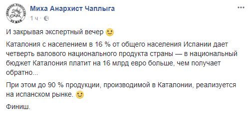 Михаил Чаплыга, политолог, блогер: "Каталония с населением в 16 % от общего населения Испании дает четверть валового национального продукта страны — в национальный бюджет Каталония платит на 16 млрд евро больше, чем получает обратно... При этом до 90 % продукции, производимой в Каталонии, реализуется на испанском рынке. Финиш".