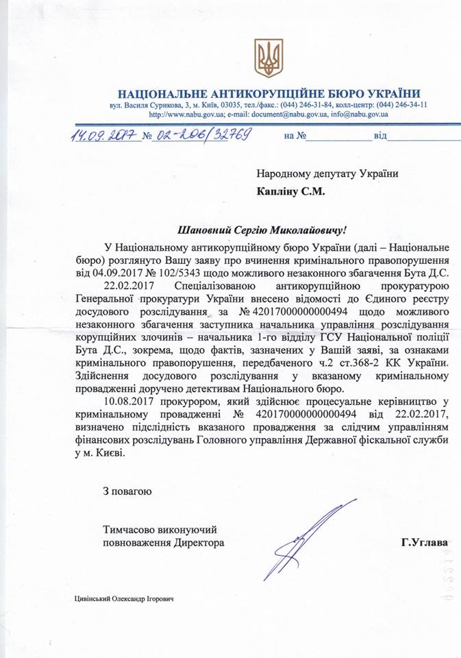 НАБУ еще с февраля 2017 года расследует незаконное обогащение скандального замначальника следственного управления Нацполиции Дмитрия Бута. Об этом сообщил нардеп Сергей Каплин в Facebook, ссылаясь на ответ от НАБУ на его депутатский запрос.
