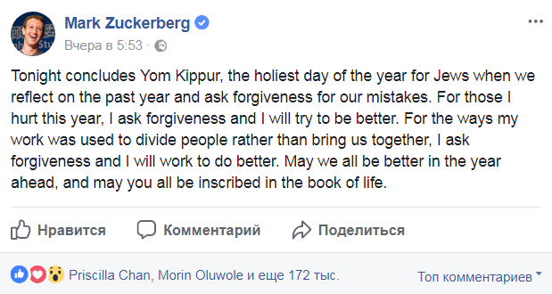 "Тем, кого я обидел в этом году, я прошу прощения и я постараюсь быть лучше", - написал Цукерберг.