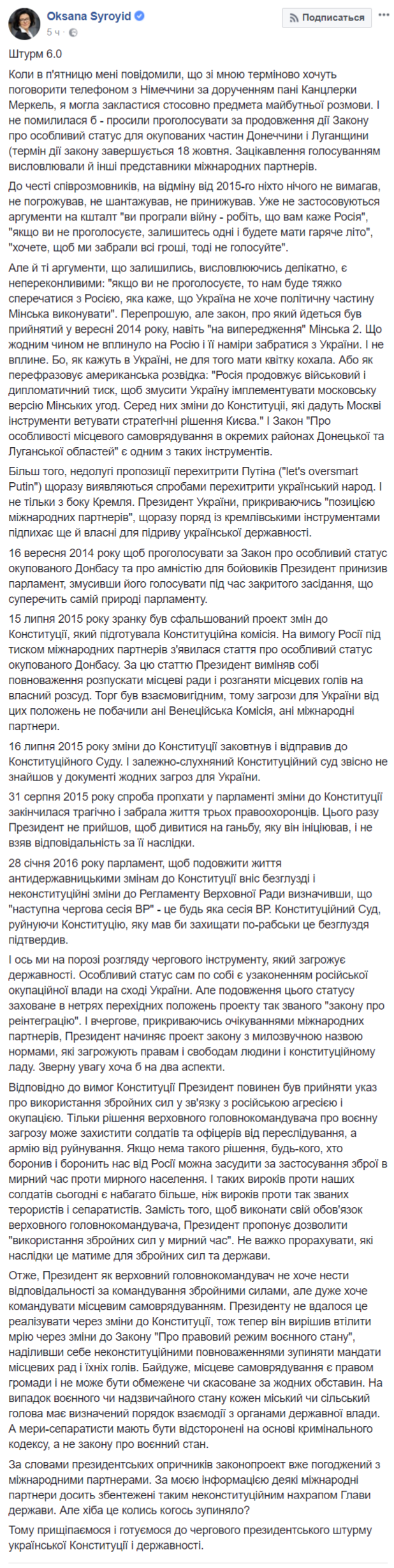 Сама же вице-спикер назвала предстоящее голосование очередным президентским штурмом украинской конституции и государственности.