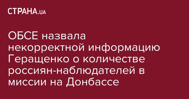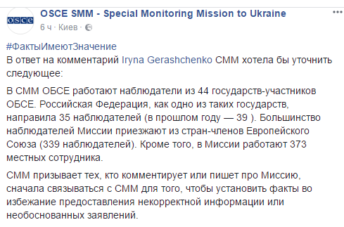 Специальная мониторинговая миссия (СММ) ОБСЕ призвала не распространять некорректную информацию о ее составе на фоне заявления представителя Украины в гуманитарной подгруппе контактной группы Ирины Геращенко об увеличении количества наблюдателей от России. Соответствующее заявление миссии было  размещено в Facebook.