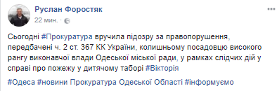 Прокуратура объявила о подозрении бывшему чиновнику Одесского городского совета в связи с пожаром в лагере "Виктория". Об этом сообщил советник руководителя областного управления Нацполиции Руслан Форостяк на своей странице в Facebook.