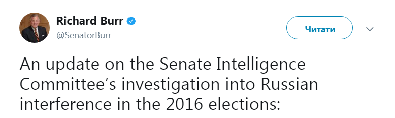 Обновленная информация о расследовании Сенатского разведывательного комитета о вмешательстве России в выборы 2016 года:, фото: twitter.com/SenatorBurr