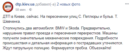 ДТП произошло на пересечении бульвара Шевченко и улицы Петлюры. Столкнулись два автомобиля: BMW и Skoda (Uber). Предварительно столкновение произошло из-за нарушения правил проезда и пересечения перекрестков.