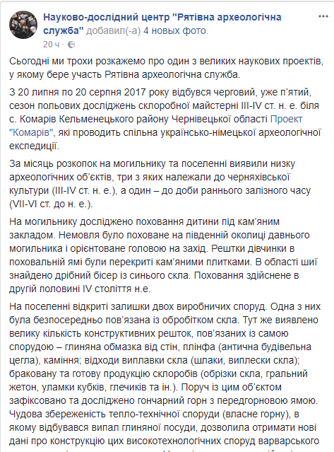 В Черновицкой области во время раскопок нашли ряд археологических объектов, среди которых могильник IV века с погребением младенца. Об этом сообщается в Facebook Научно-исследовательского центра "Спасательная археологическая служба".