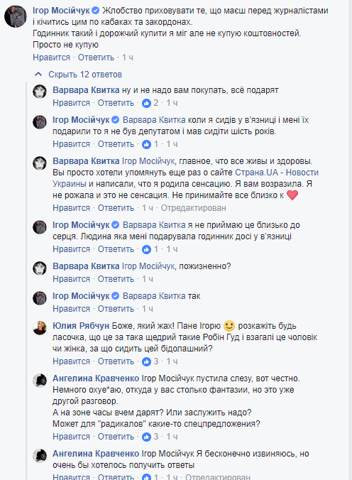 Сейчас Мосийчук оправдывается, что новость про дорогие часы "не сенсация", потому что он их задекларировал, рассказывал про них программе "Инсайдер" телеканала ICTV и их ему подарил сокамерник.