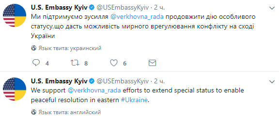 Накануне голосования в Раде, 4 октября, американское посольство в Киеве высказало поддержку законопроекта, написав об этом в своем Twitter. "Мы поддерживаем усилия Верховной Рады продлить действие особого статуса, что позволит мирно урегулировать конфликт на востоке Украины", - сказано в сообщении.
