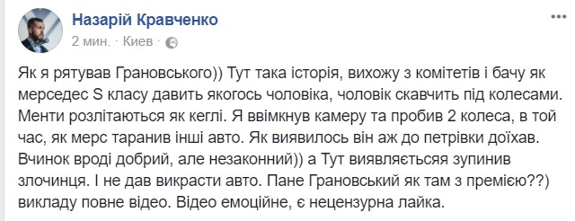 Непосредственными участниками инцидента со "взбесившимся мерсом" стал заместитель главы партии "Национальный Корпус" Назар Кравченко. Он активно пытался помешать злоумышленнику покинуть правительственный квартал, не гнушаясь методами.