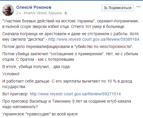 Потом дело переквалифицировали в "убийство по неосторожности". Потом убийца заключил "соглашение о примирении". Нет, не с убитым отцом. С братом - как с потерпевшим. В итоге, убийца получил... два года. Условно! И работает себе дальше. С его зарплаты вычитают по 10 % в доход государства. Вот приговор. Про приговор Васильцу и Тимонину 9 лет за создание ютуб-канала надо напоминать? Украинское "правосудие" во всей красе", - написал он.