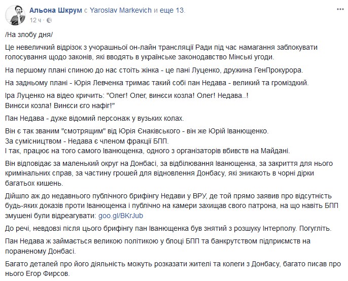 "Теперь понимаю, для чего в парламенте депутаты из Енакиево. Только утром увидел, что фразу "Олег, вынеси козла" жена генпрокурора Ирина Луценко в Раде кричала нардепу Олегу Недаве. На исконно русском языке", пишет у себя в Facebook журналист из Горловки Александр Билинский.