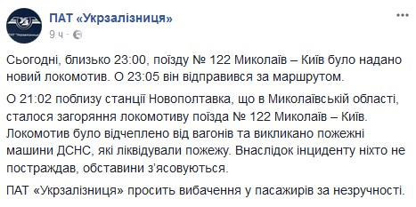 "Сегодня, около 23:00, поезду №122 Николаев - Киев был предоставлен новый локомотив. В 23:05 он отправился по маршруту", - заявили в "Укрзализныце".