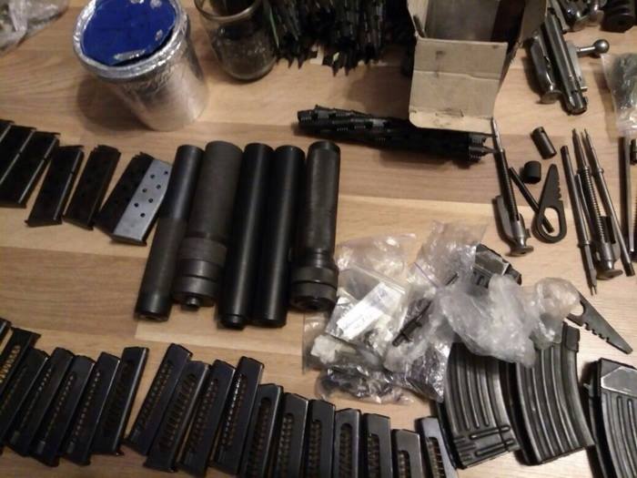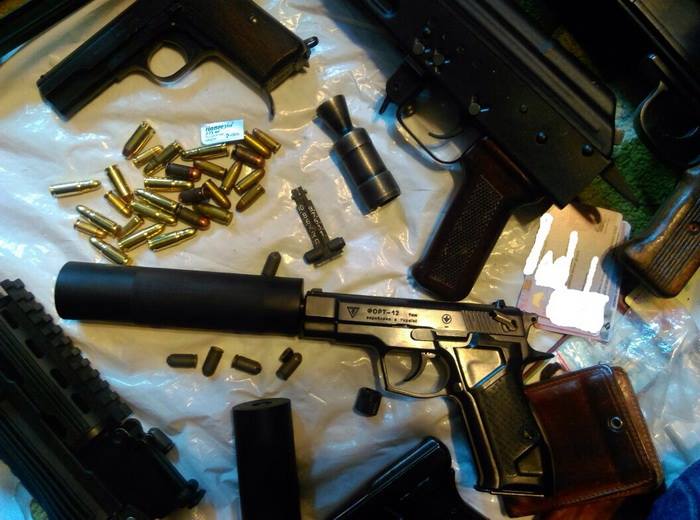 Во время одновременных обысков по месту жительства и временного пребывания членов группировки на территории Киевской и Запорожской областей оперативники спецслужбы изъяли ручной пулемет Калашникова, четыре автомата АКМС и АКС, двенадцать пистолетов различных марок, в том числе револьверы, два пистолета-пулемета, гранату РГД-5, карабин, глушитель, более 700 патронов различного калибра и большое количество составных частей к огнестрельному оружию.