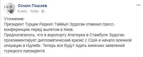 "Президент Турции Реджеп Таййып Эрдоган отменил пресс-конференцию перед вылетом в Киев. Предполагалось, что в аэропорту Ататюрка в Стамбуле Эрдоган прокомментирует дипломатический кризис с США и начало военной операции в Идлибе. Теперь все будут ждать киевских заявлений турецкого президента", - написал Пашаев.