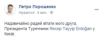 Президент Украины Петр Порошенко начал встречу с президентом Турции Реджепом Тайипом Эрдоганом. В своем Facebook он поместил фото рукопожатия с Эрдоганом, на церемонии встречи также участвовали жены президентов. Появилось также и видео официальной встречи.