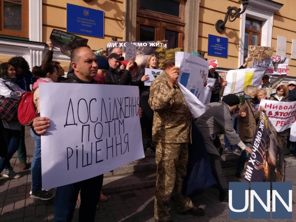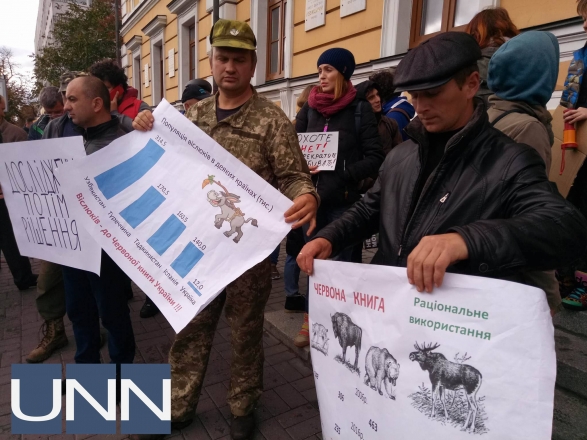 Вместе с активистами под Управления делами НАН Украины вышли охотники и работники охотничьих хозяйств, которые считают, что внесение лося в Красную книгу лишь вызовет появление большего числа браконьеров.