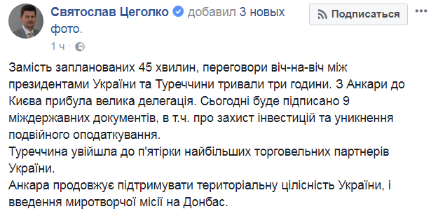 В понедельник, 9 октября президент Турции прибыл в Украину с официальным визитом. Личные переговоры президента Украины Петра Порошенко с турецким лидером Реджепом Тайипом Эрдоганом продолжались три часа. Согласно запланированному графику визита президента Турции, эта встреча должна была длиться 45 минут.