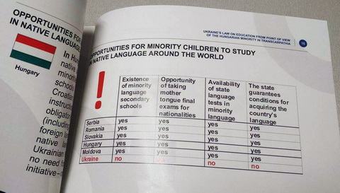 В качестве доказательства в брошюре "Возможности для детей меньшинств изучать родной язык" приводятся примеры соседних Сербии, Румынии, Словакии, Венгрии, Молдовы и Польши, где только Украина по проигрывает по всем статьям.