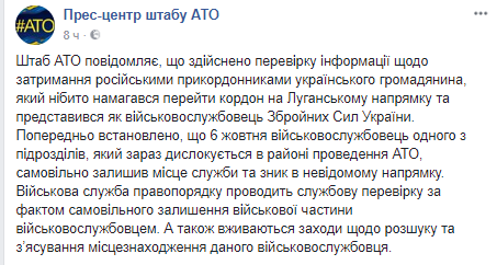 "Предварительно установлено, что 6 октября военнослужащий одного из подразделений, который сейчас дислоцируется в районе проведения АТО, самовольно оставил место службы и скрылся в неизвестном направлении. Военная служба правопорядка проводит служебную проверку по факту самовольного оставления воинской части военнослужащим. А также принимаются меры по розыску и выяснению местонахождения данного военнослужащего", - сообщили в пресс-службе штаба АТО на официальной странице в Facebook.