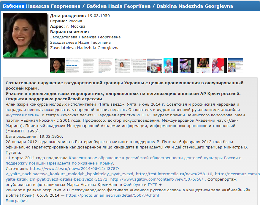 Поводом для включения в базу данных стало выступление Бабкиной на концерте в Крыму.