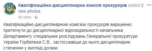 Также отметим, что это уже не первый у Горбатюка - ранее генпрокурор Юрий Луценко уже наказывал Горбатюка за "ненадлежащую организацию расследования уголовных производств бывших чиновников времен Януковича".