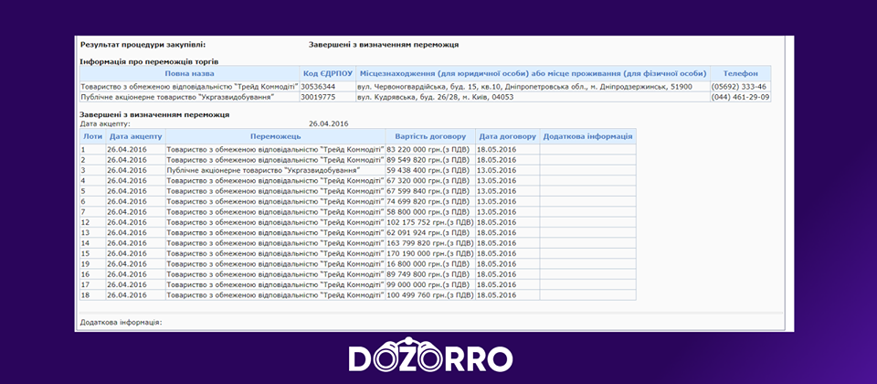 Активисты Dozorro опубликовали тендеры, о которых шла речь. Все, кроме одного выиграла фирма "Трейд Коммодити". Еще один тендер выиграда Укргаздобыча.