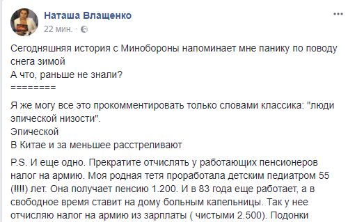 Наталья Влащенко, телеведущая: "Сегодняшняя история с Минобороны напоминает мне панику по поводу снега зимой. А что, раньше не знали? Я же могу все это прокомментировать только словами классика: "люди эпической низости". Эпической. В Китае и за меньшее расстреливают