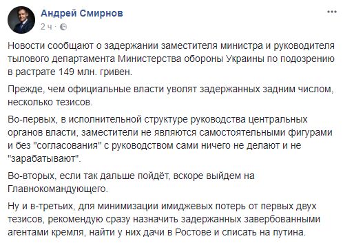 Андрей Смирнов, известный адвокат: "Новости сообщают о задержании заместителя министра и руководителя тылового департамента Министерства обороны Украины по подозрению в растрате 149 млн. гривен.