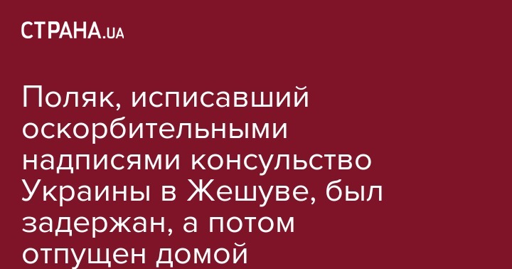 Мужчина, сделавший антиукраинские надписи на стене здания почетного консульства Украины в г.Жешув (Польша), был задержан в пятницу, 6 октября, ему было предъявлено обвинение, после чего он был отпущен домой, сообщает местное издание "Rzeszów News".