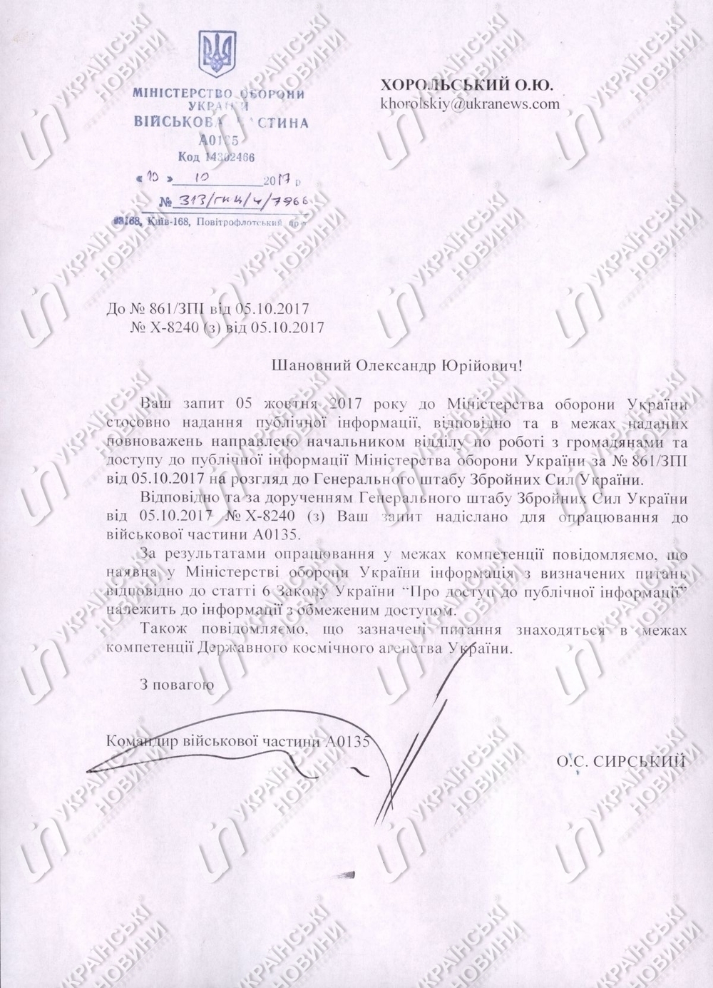 Минобороны переадресовало запрос в Генеральный штаб Вооруженных сил Украины, а тот в свою очередь - в воинскую часть А0135. Отвечая на запрос, командир воинской части А0135 сообщил, что запрашиваемые сведения являются информацией с ограниченным доступом, а также дополнительно отметил, что подобные вопросы относятся к компетенции Государственного космического агентства Украины.