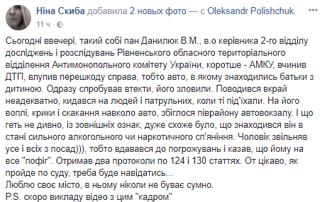 По ее данным, ДТП произошло вечером 11 октября с участием и.о. руководителя отдела расследований Ровенского областного территориального отделения Антимонопольного комитета Виктора Данилюка. После аварии он пытался сбежать, но его задержали.