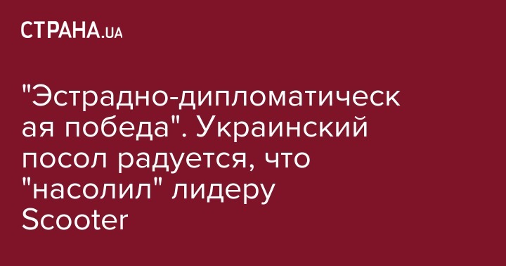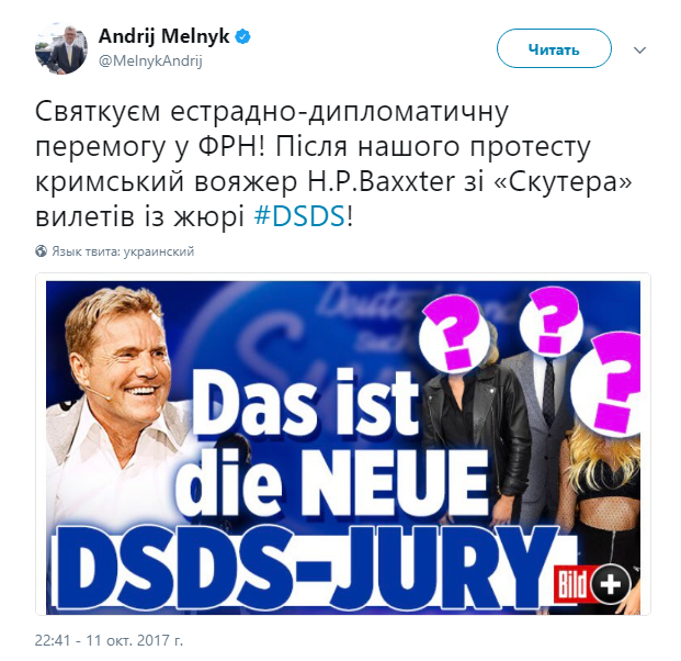 Украинское посольство в Германии празднует, что из-за их протеста вокалист немецкой группы Scooter Эйч Пи Бакстер, который выступал в аннексированном Крыму, вылетел из состава жюри местного телешоу. Об этом в Twitter сообщил посол Андрей Мельник, который и высказывался в адрес музыканта.