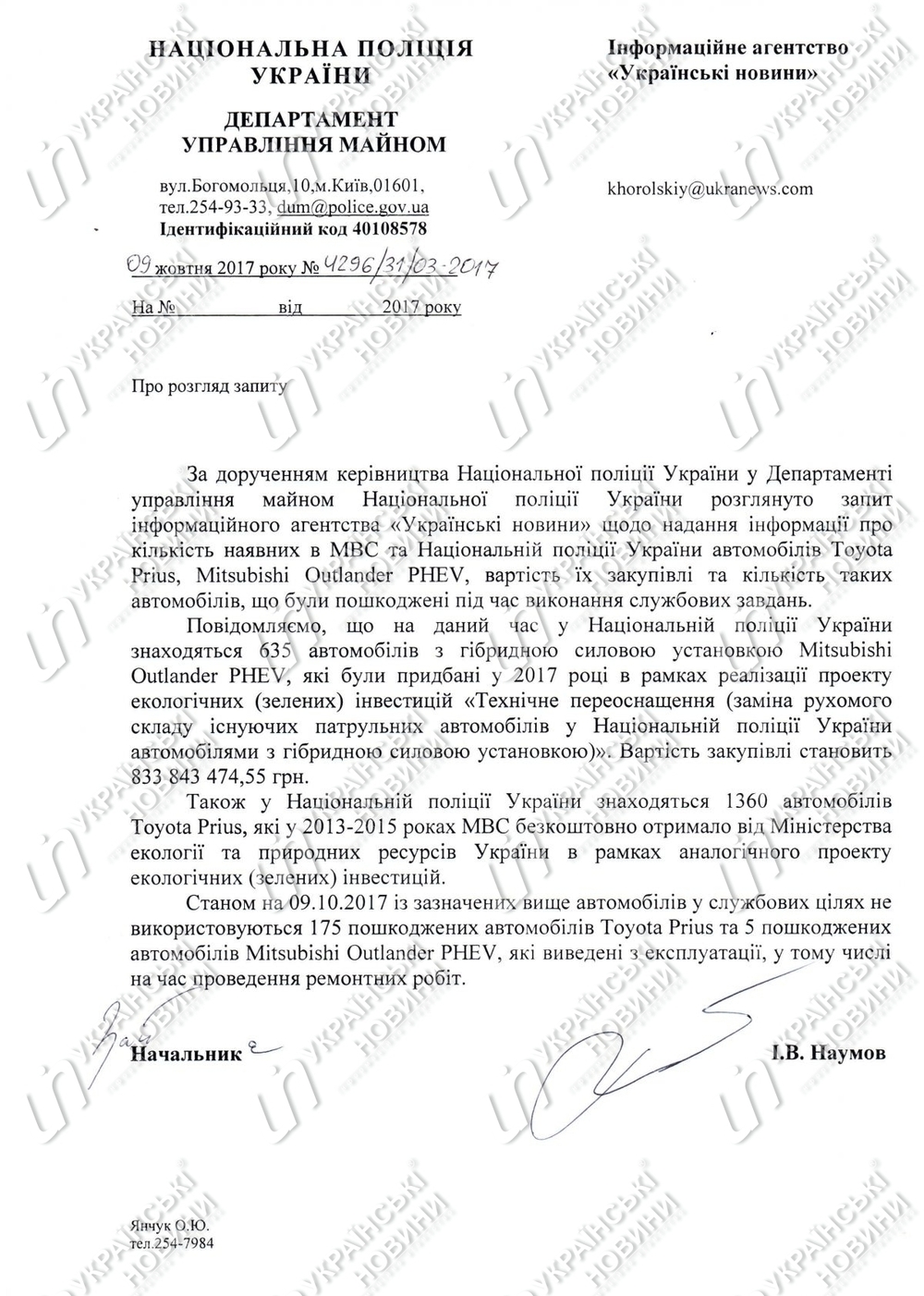Сотрудники Национальной полиции Украины по состоянию на 9 октября текущего года повредили 180 служебных автомобилей, среди которых 175 автомобилей Toyota Prius и 5 автомобилей Mitsubishi Outlander PHEV.