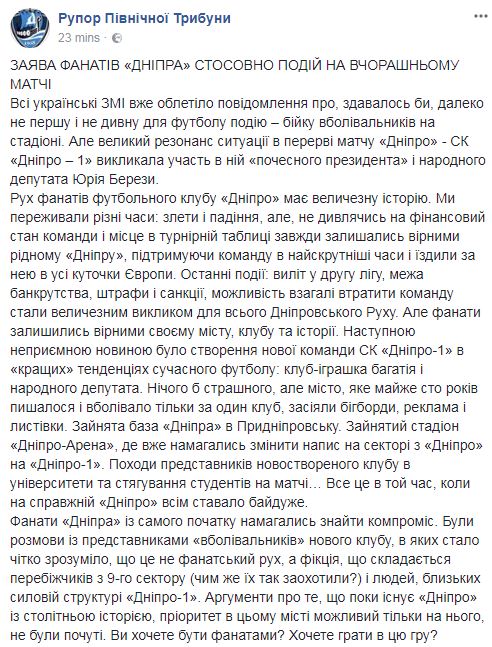Фанаты "Днепра" в заявлении, опубликованном в Fаcebook, разъяснили свою точку зрения на ситуацию вокруг драки между болельщиками и нардепом от "Народного фронта", президентом СК "Днепр-1" Юрием Березой.