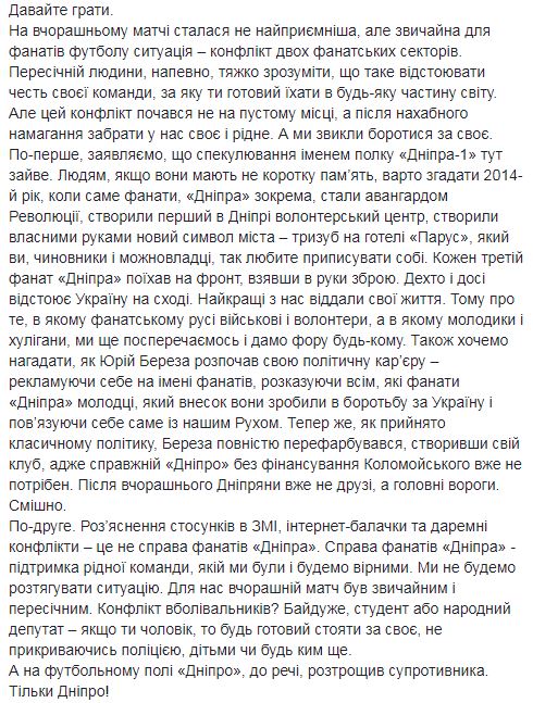 "Юрий Береза ​​начал свою политическую карьеру - рекламируя себя на имени фанатов, рассказывая всем, что фанаты "Днепра" молодцы, какой вклад они сделали в борьбу за Украину и связывая себя именно с нашим движением. Теперь же, как принято классическом политику, Береза ​​полностью перекрасился, создав свой клуб, ведь настоящий "Днепр" без финансирования Коломойского уже не нужен. После вчерашнего днепряне уже не друзья, а главные враги", - пишут болельщики команды из Днепра.