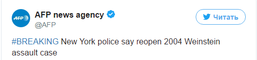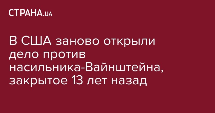 Полиция Нью-Йорка возобновила дело против продюсера Харви Вайнштейна, который оказался в центре скандала о сексуальном насилии. Дело было начато в 2004 году. Об этом в Twitter сообщает AFP.