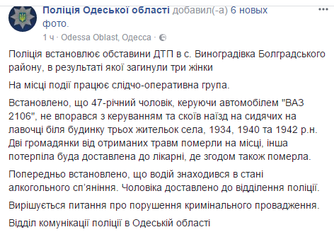 В Одесской области пьяный водитель насмерть раздавил трех бабушек на лавочке