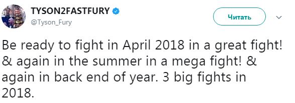 "Буду готов к великому бою в апреле 2018-го, и опять летом того же года к мегабою, и вновь в конце года. Три больших боя в 2018 году", - написал Фьюри.