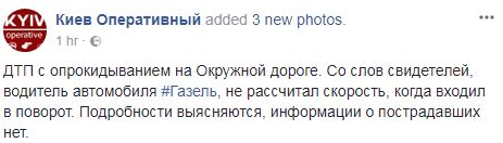 В Киеве на Кольцевой дороге утром произошло ДТП с участием грузового автомобиля "Газель". Об этом сообщает на своей странице в Facebook сообщает "Киев Оперативный".