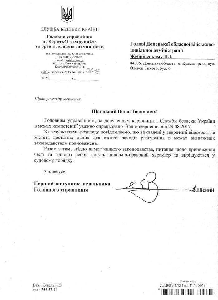 По словам Жебривского, он уже получил ответ от Службы безопасности Украины относительно рассмотрения его обращения.