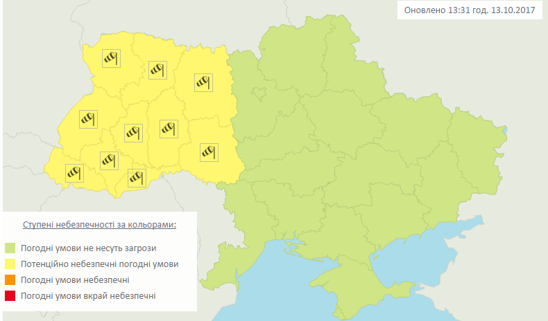 Так, до конца суток 13 октября и 14 октября в Волынской, Ровненской, Львовской, Тернопольской, Хмельницкой, Ивано-Франковской, Закарпатской, Черновицкой, Житомирской и Винницкой областях порывы ветра 15-20 м/с.
