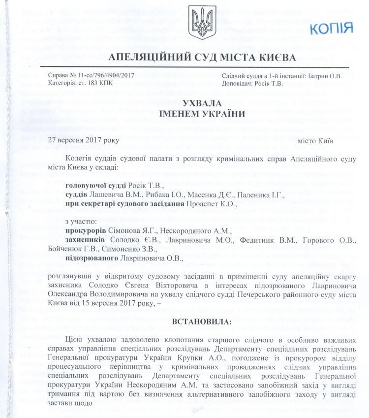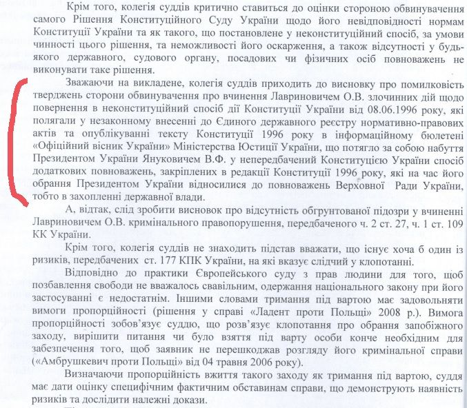 При этом, суд пришел к выводу, что органом досудебного расследования не доказано наличие обоснованного подозрения в совершении Александром Лавриновичем уголовного правонарушения, предусмотренного ч. 2 ст. 27, ч. 1 ст. 109 Уголовного кодекса Украины.