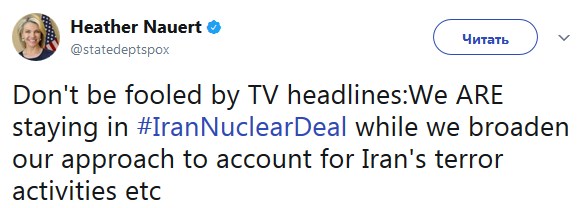 "Не позволяйте ТВ-заголовкам себя обмануть: мы остаемся в ядерной сделке с Ираном, в то же время мы расширяем наш подход в контексте террористической деятельности в Иране", - написала она.