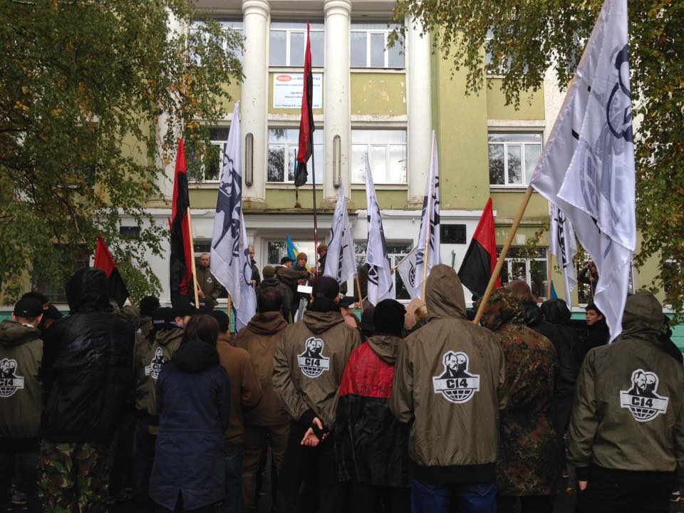 Активисты держат национальную символику, флаги "Национального корпуса", "Правого сектора" и "Свободы".